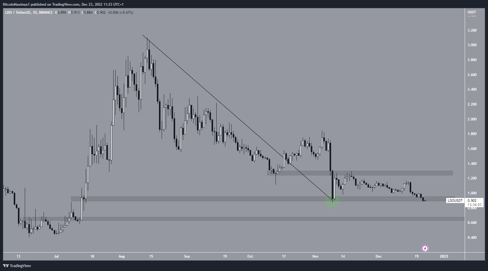 O preço da LDO caiu abaixo de uma linha de tendência de baixa em 17 de outubro e voltou para validá-la como suporte em 9 de novembro (círculo verde). No entanto, ele não conseguiu iniciar um movimento de alta e agora corre o risco de cair abaixo da área de suporte horizontal de US$ 0,90.