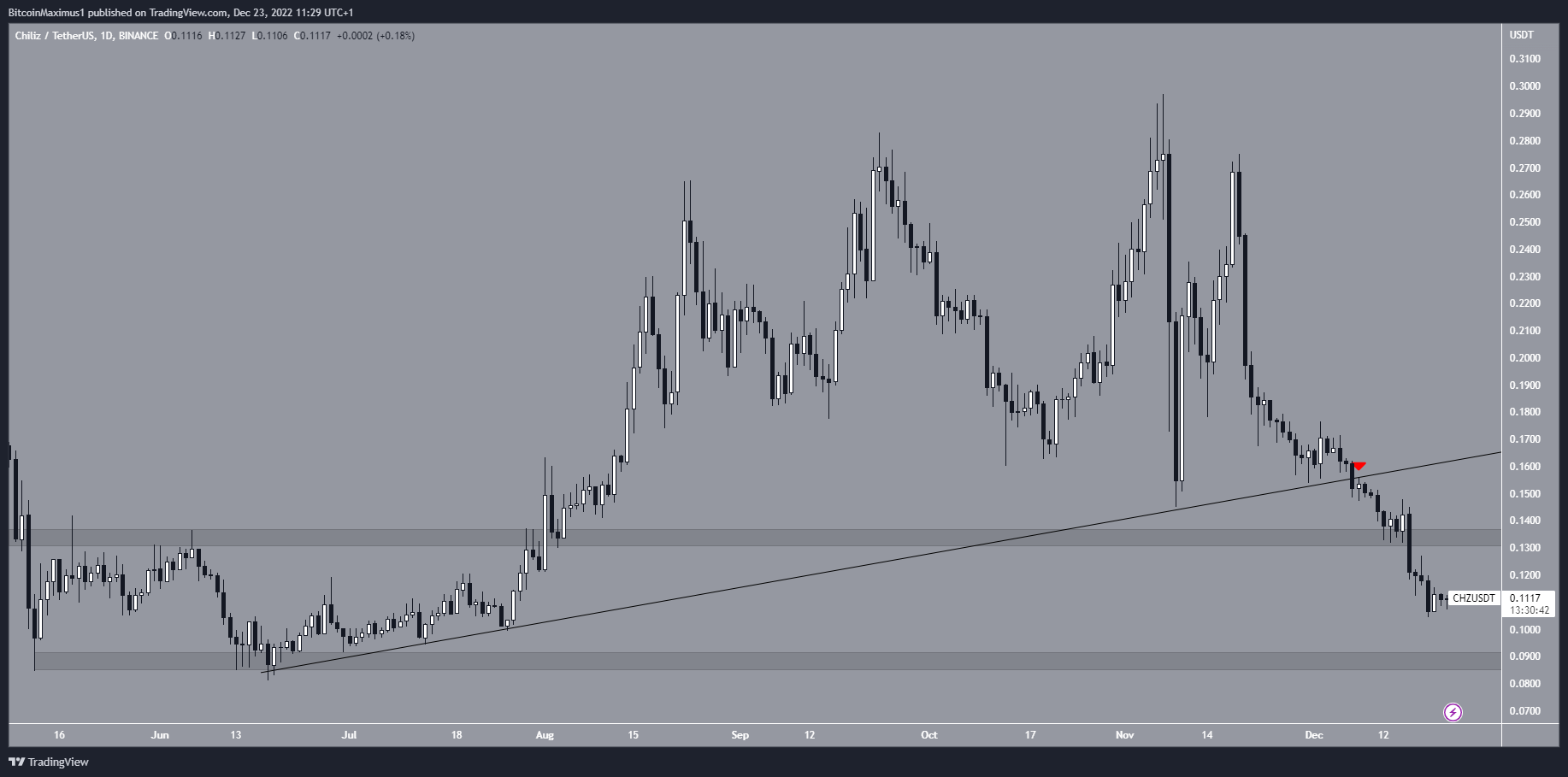 Embora se esperasse que o preço da CHZ aumentasse durante a Copa do Mundo da FIFA, na verdade ele caiu consideravelmente. O token caiu abaixo de uma linha de tendência de alta em 8 de dezembro e caiu abaixo da área de suporte horizontal de US$ 0,135 oito dias depois.