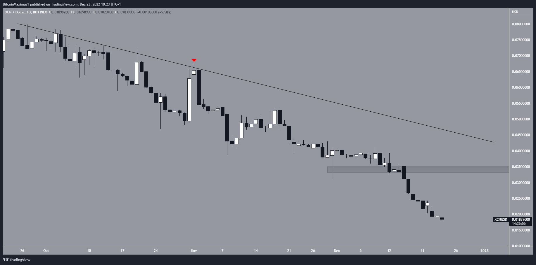 O preço do XCN está abaixo de uma linha de tendência de baixa desde 27 de setembro. A linha causou uma queda em 1º de novembro (ícone vermelho) e o preço acelerou seu movimento de baixa posteriormente. Isso levou a uma nova mínima histórica de US$ 0,018 feita na última quarta-feira (21).
