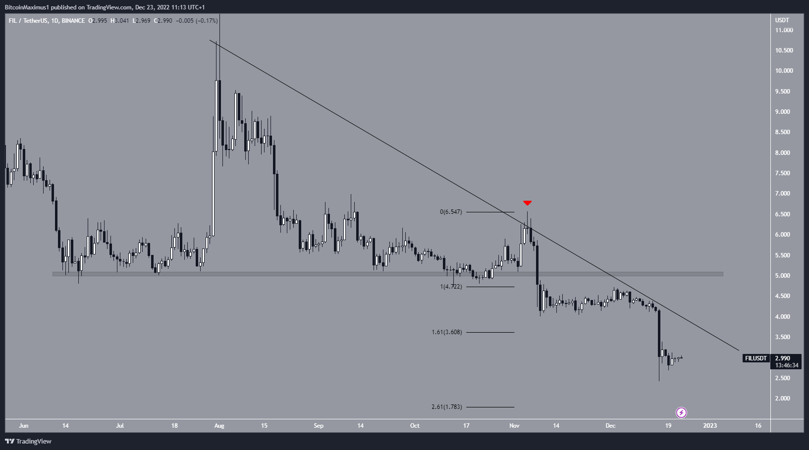 O preço do FIL está abaixo de uma linha de tendência de baixa desde 1º de agosto. A linha causou uma rejeição em 5 de novembro (ícone vermelho). Isso levou o preço do ativo a uma nova mínima anual, caindo abaixo da área de suporte horizontal de US$ 5.