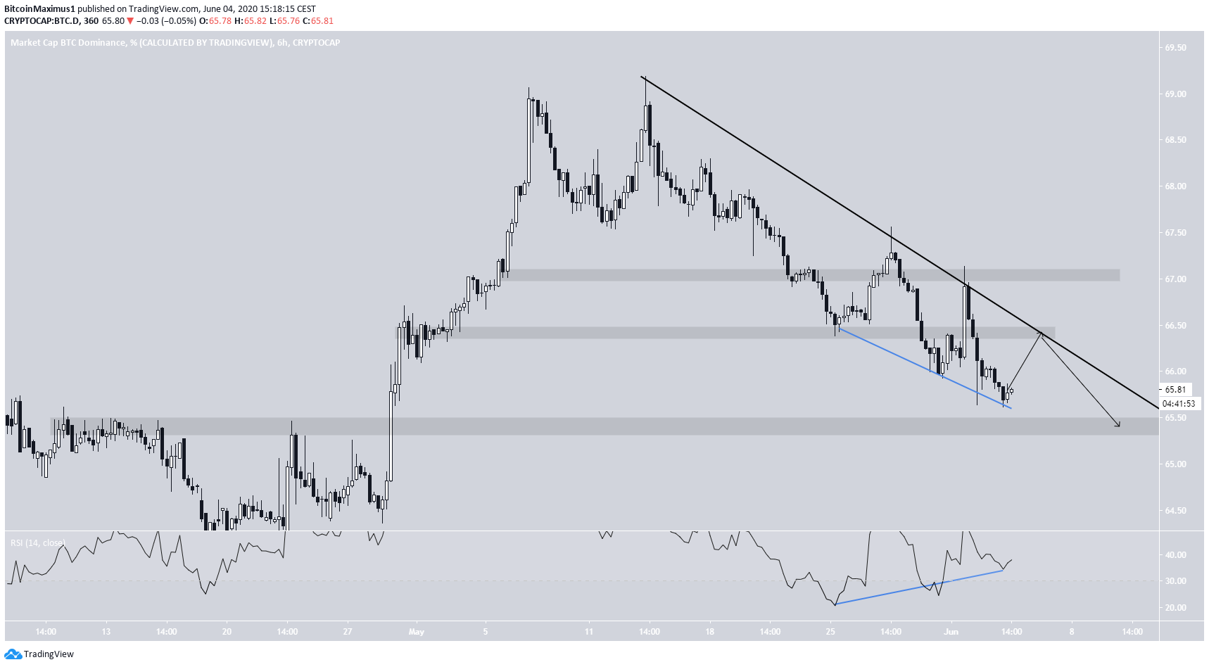 A taxa de dominância do Bitcoin (BTCD) caiu constantemente ao lado de uma linha de resistência descendente a partir de 14 de maio. O preço está mostrando sinais de reversão a curto prazo, mas a tendência permanece baixa enquanto o BTCD estiver abaixo dessa linha.