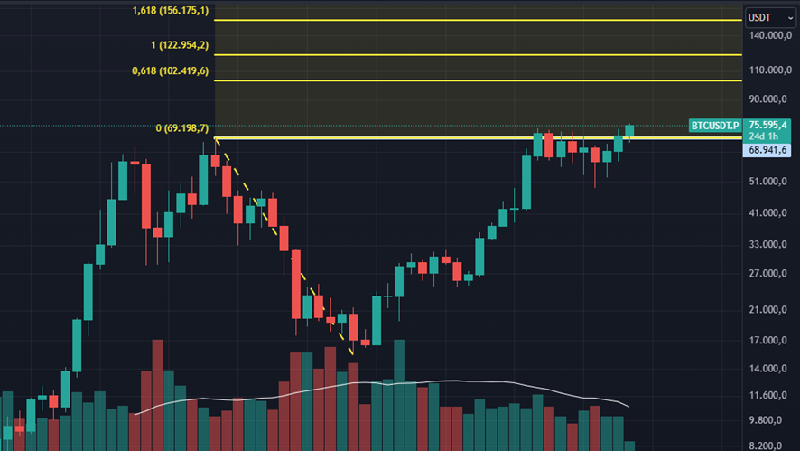 Na análise técnica, o Bitcoin está apresentando um padrão gráfico conhecido como “Cup & Handle” (ou “Xícara com Alça”), uma formação que sugere alta nas próximas semanas. Esse movimento tende a ser acompanhado por uma corrida aos alvos esperados, o que induz a uma valorização no curto prazo.