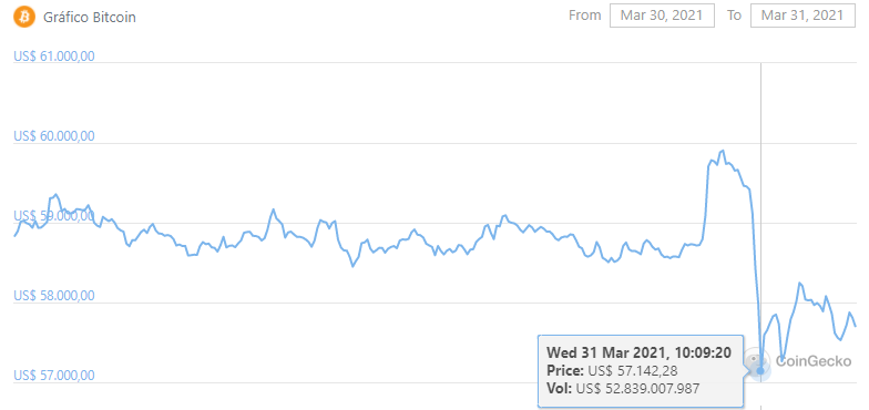 O bitcoin chegou a US$ 59.900, mas logo diversas execuções de vendas levaram a um forte recuo para a casa dos US$ 57.100. Segundo dados do Coingecko, tudo aconteceu em cerca de uma hora, entre 4h e 5h da manhã.