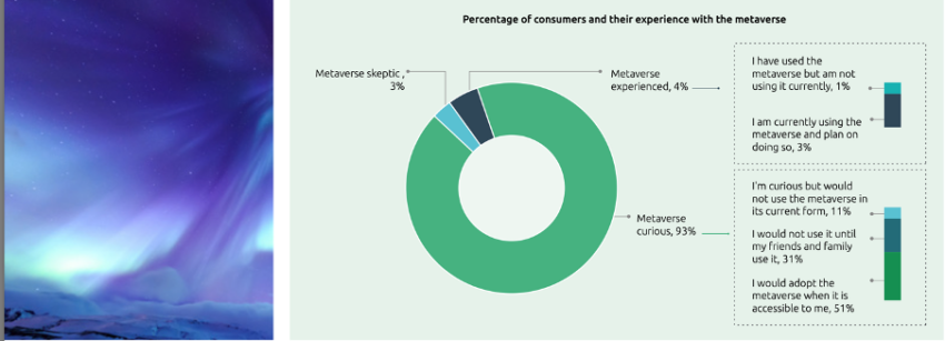 Notavelmente, os registros revelaram que 93% dos consumidores pesquisados afirmaram estar curiosos sobre o metaverso. Desse número, 51% afirmaram que podem usar o metaverso, pois fica mais disponível para eles.
