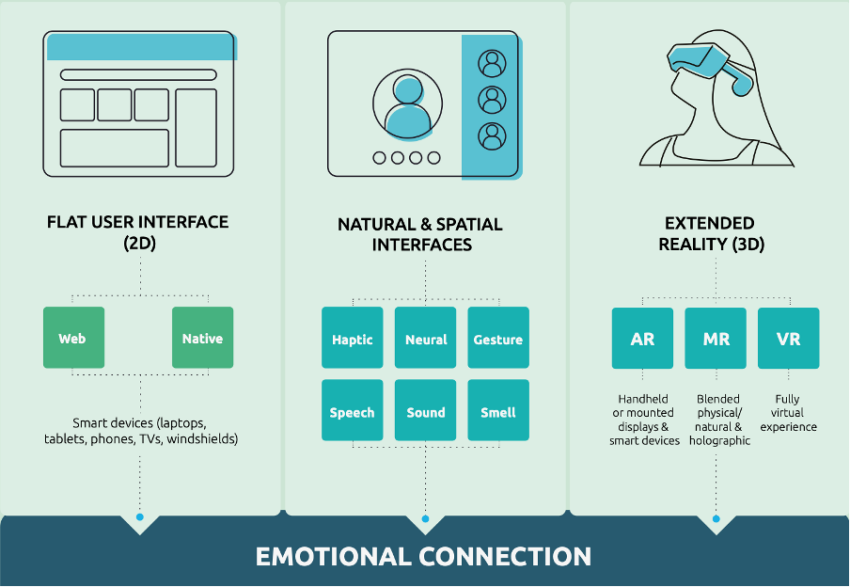 Para ver o que o metaverso significaria para consumidores e empresas, há dois aspectos principais a serem considerados. Primeiro, os ambientes espaciais, que é a relação 3D com a tecnologia no metaverso, em contraste com o 2D presente hoje.