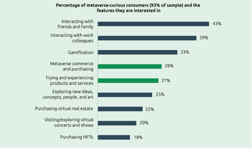Além disso, o relatório também esclareceu diferentes aspectos das experiências do cliente. Este caso abordou o tipo de interação do metaverso que os clientes procuram, para o qual 43% dos entrevistados afirmaram que gostariam de interagir com amigos e sua própria família. Isso é seguido pelo auxílio de interações com colegas (39%), histórias relacionadas a jogos (33%) e passatempos comerciais (28%).