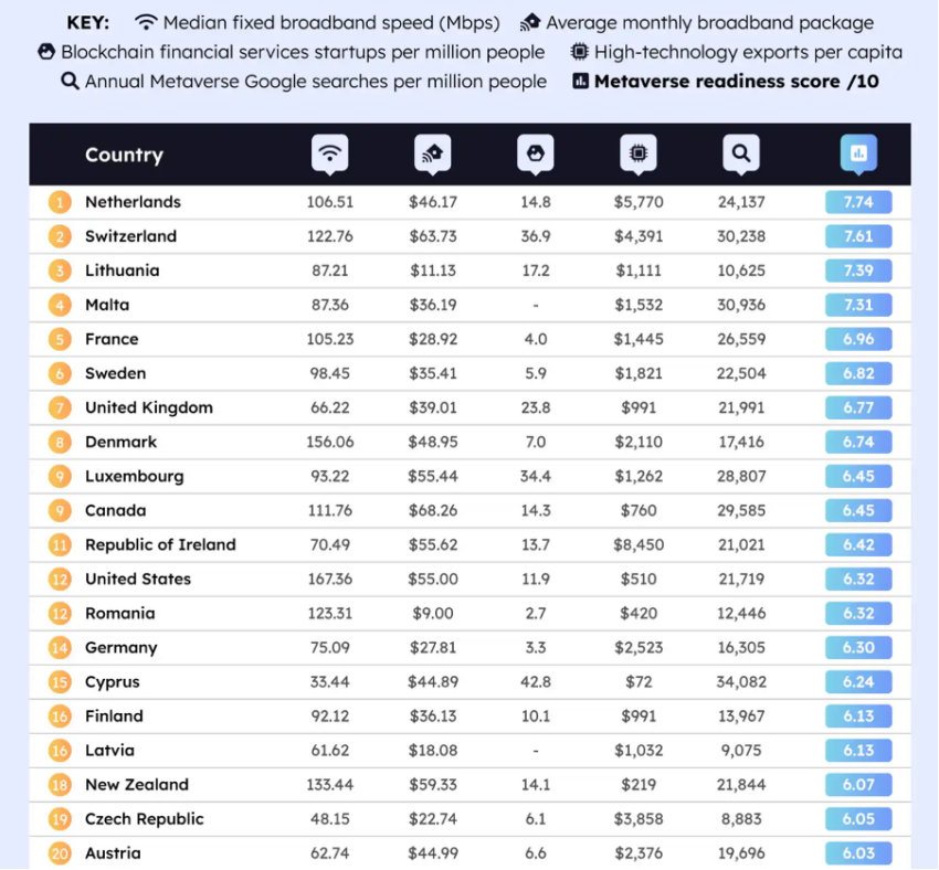 Assim, dados os requisitos, o Uwitch circulou um relatório que se concentrou nas nações mais “prontas para o metaverso”. A Holanda ficou em primeiro lugar, seguida pela Suíça e Lituânia.