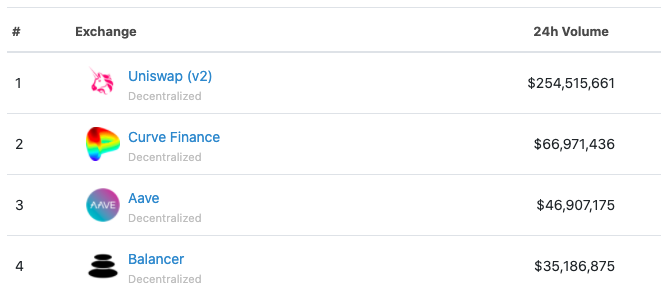SponsoredA participação de mercado da Uniswap tem crescido rapidamente nos últimos meses. De acordo com dados da CoinGecko, a Uniswap faturou US $ 254 milhões em volume ontem – quase quatro vezes mais do que o pool de liquidez descentralizado mais próximo.