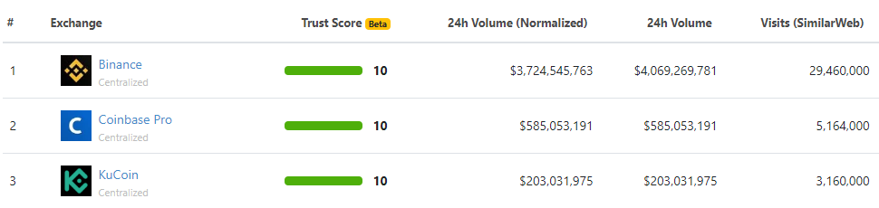 SponsoredO volume total da Uniswap a coloca em uma posição para começar a rivalizar com algumas das exchanges maiores e centralizadas. No momento da publicação, o volume da Uniswap rivalizava com algumas das exchanges de criptomoedas centralizadas mais bem cotadas, superando o KuCoin por uma margem considerável e correspondendo a quase 45% do volume 24H no Coinbase Pro.