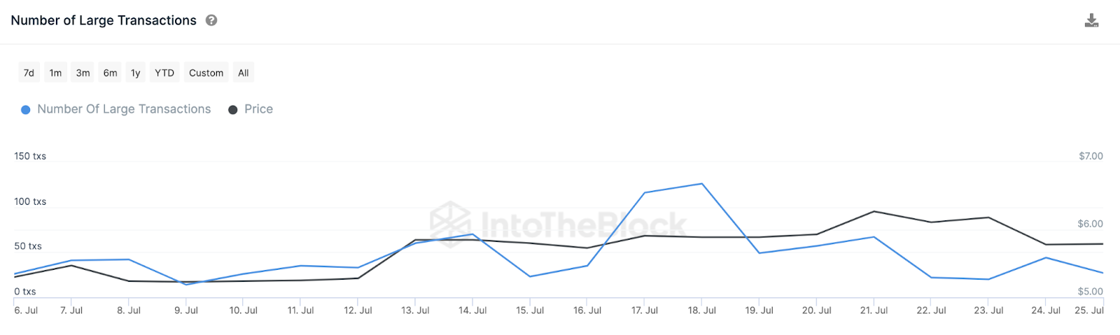 O gráfico do IntoTheBlock abaixo ilustra como as transações UNI Whale (linha azul) caíram 78% entre 18 e 25 de julho. Em termos nominais, as baleias realizaram 126 transações em 18 de julho. Mas no fechamento de 25 de julho, havia apenas 27 grandes transações envolvendo a UNI.