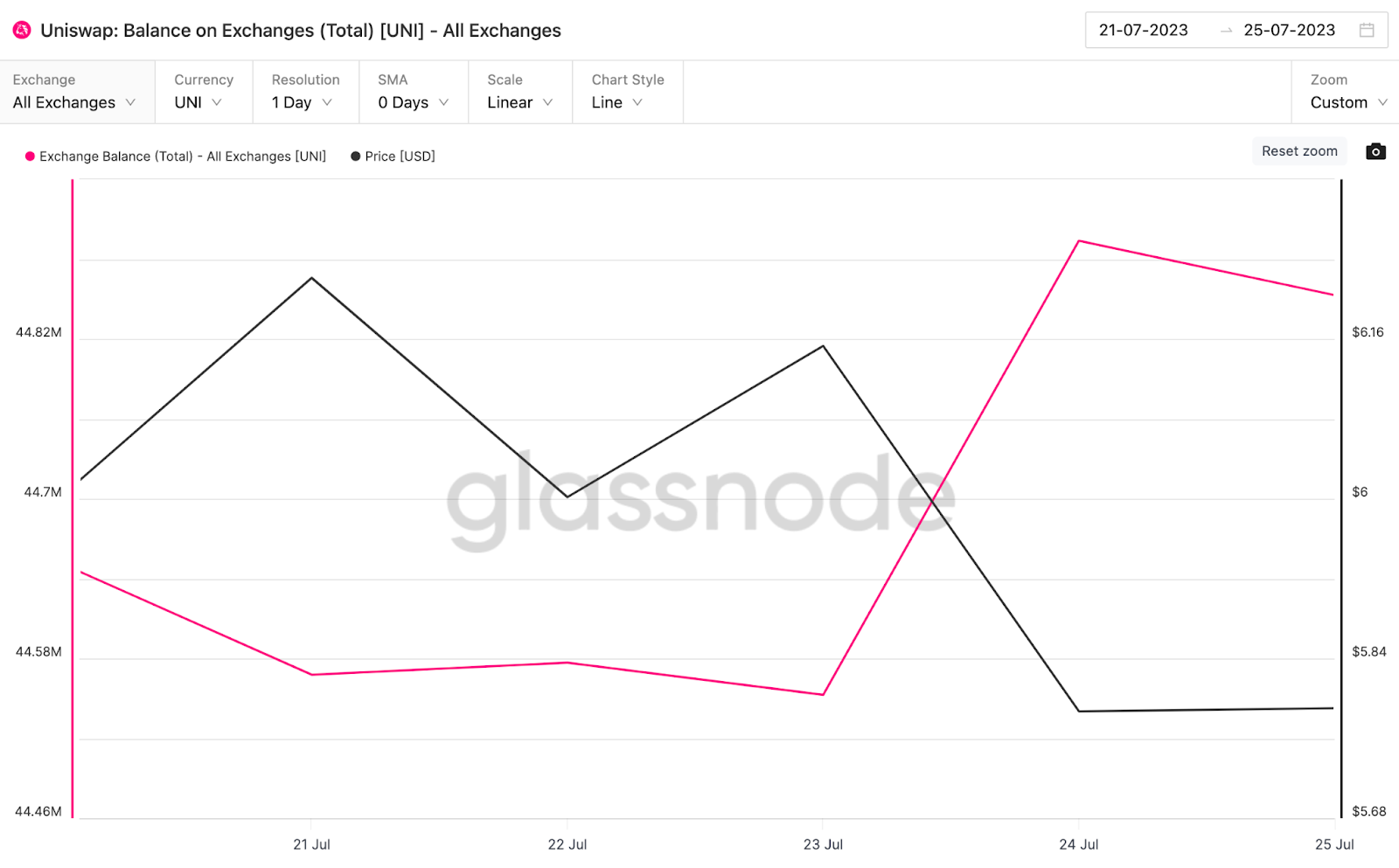De acordo com dados compilados pela Glassnode, os tokens UNI depositados em carteiras das exchanges subiram de 44,5 milhões para 44,8 milhões entre 21 e 26 de julho. Isso representa um aumento de 285.000 tokens nas reservas de exchnages.