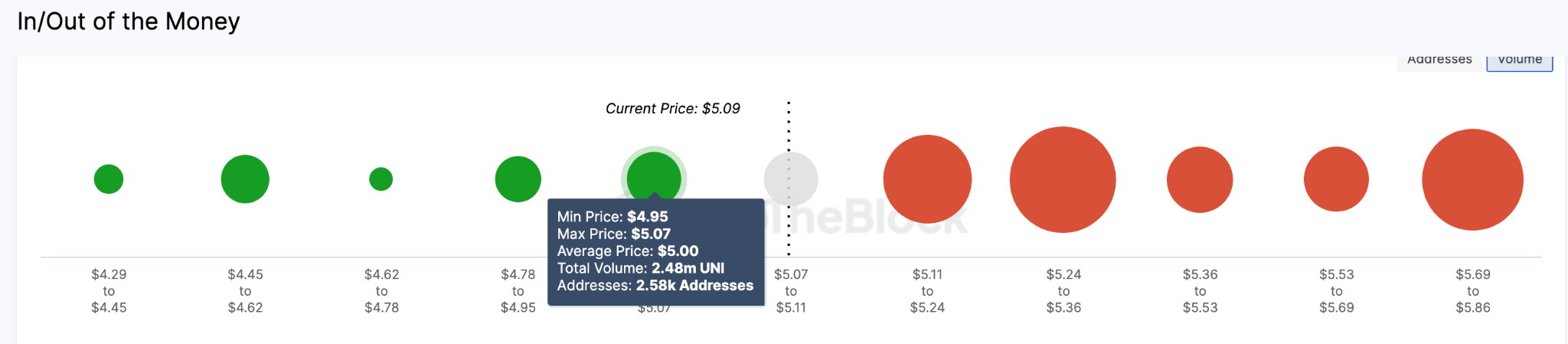 Considerando a desaceleração da demanda e a atividade de baixa entre as baleias, um declínio em direção a US$ 4,50 parece a previsão de preço mais provável para a UNI. Embora os dados In/Out of The Money Around Price (IOMAP) do IntoTheBlock sugiram que o ativo terá suporte inicial em torno da zona de US$ 5.