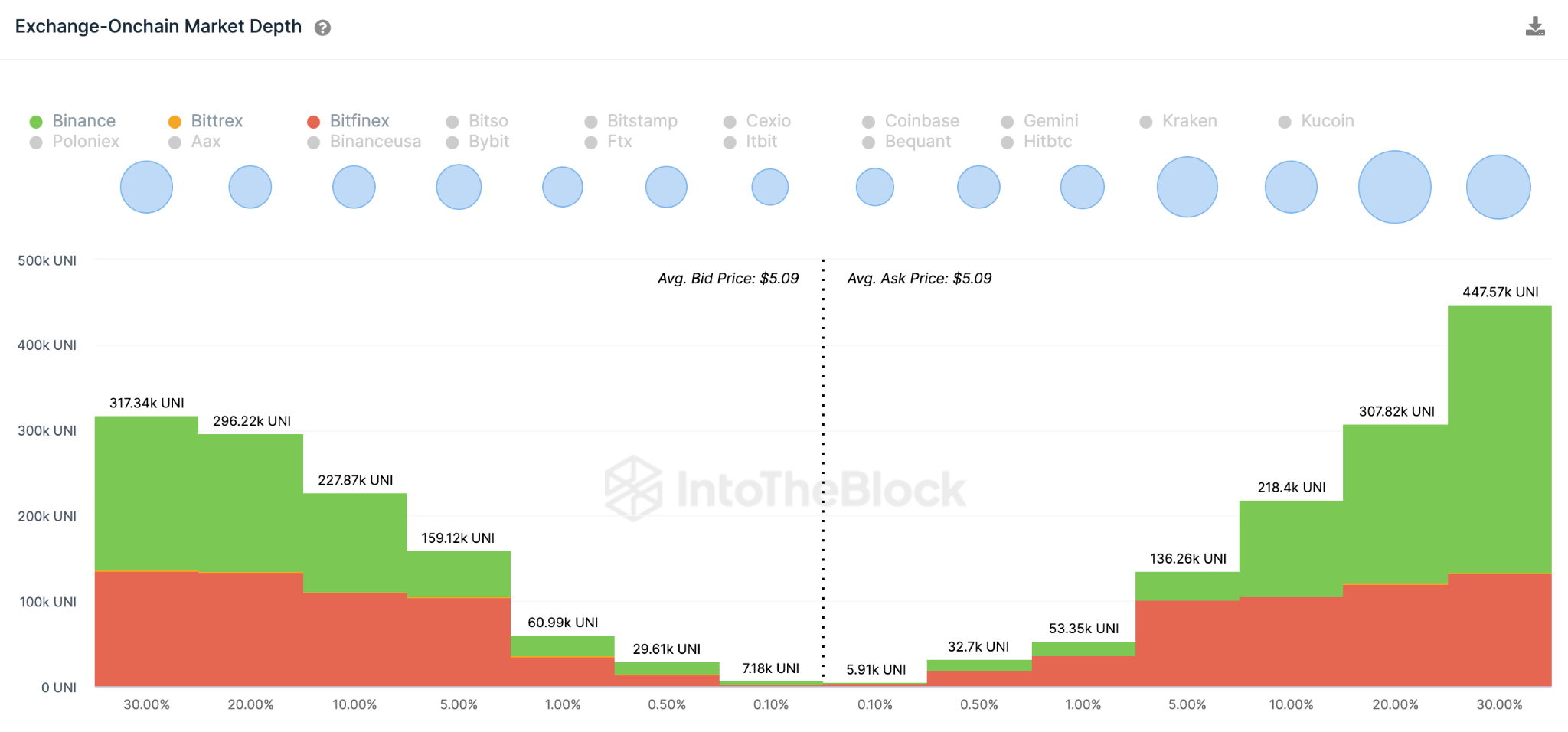 Além disso, os traders da Uniswap estão procurando descarregar uma quantidade considerável de tokens UNI em torno dos preços atuais. O gráfico de profundidade do mercado on-chain mostra um agregado do total de pedidos de compra/venda feitos pelos detentores em várias exchanges.