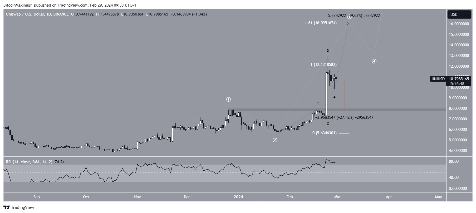 Se a contagem estiver correta, a UNI iniciará outro salto após a conclusão da correção atual. Isso pode levar o preço para a próxima resistência em US$ 16,10, dando às ondas um e três uma proporção de 1:1,61.