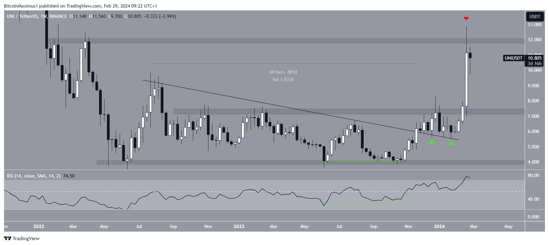Após vários retestes, o preço realizou outro salto no início de 2024 e rompeu uma área de resistência horizontal. O movimento culminou com uma alta de US$ 12,86 na semana passada, com o token sofrendo uma leve correção desde então.