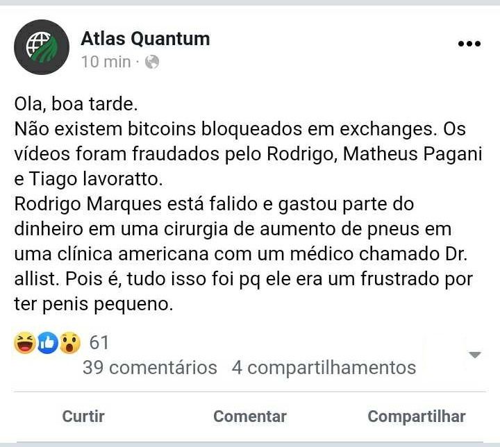 Milhares de unidades de Bitcoin do Atlas Quantum não existem. Essa é a mensagem publicada pelo perfil oficial da empresa no Facebook. Em insultos contra a plataforma e seu dono, publicações falam sobre onde está o saldo de bitcoin do Atlas Quantum.