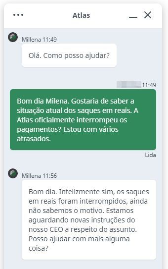 Para a surpresa da investidora, o suporte do Atlas Quantum respondeu que os pagamentos “foram interrompidos”. Para piorar, não existia nenhuma explicação para os investidores deixarem de receber do negócio.