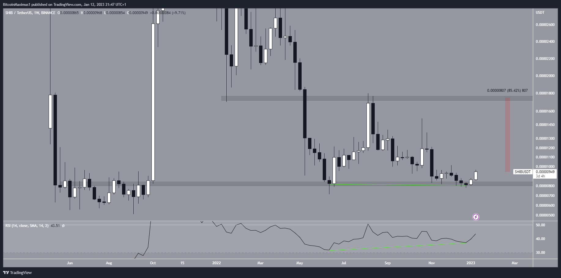 A Shiba Inu (SHIB) criou um padrão de alta dentro de uma área de suporte horizontal de longo prazo. Se confirmado, isso pode levar a uma forte alta.