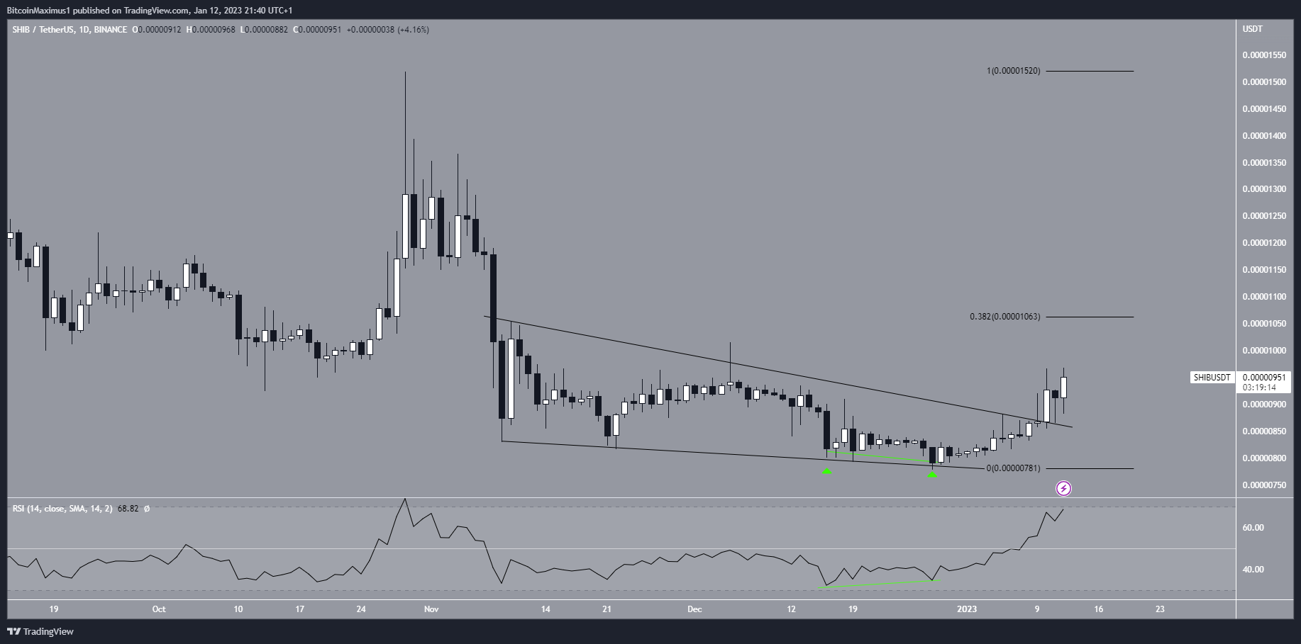 Em 10 de janeiro, a SHIB saiu da cunha. Até agora, atingiu um preço máximo de US$ 0,00000968.