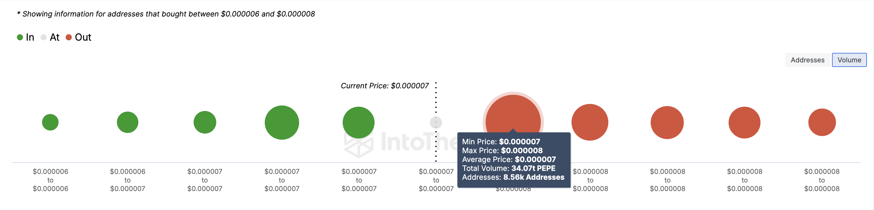 Quanto à previsão de preço, a métrica In/Out of Money Around Price (IOMAP) revela que o PEPE pode encontrar resistência significativa enquanto tenta subir. O IOMAP agrupa endereços com base em estarem ganhando dinheiro, perdendo dinheiro ou empatando no preço atual. Em seguida, analisa o volume de tokens comprados em vários níveis de preço para determinar zonas potenciais de suporte ou resistência.