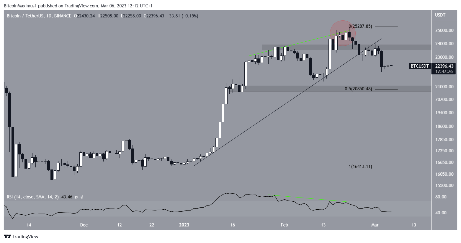 Em segundo lugar, o desvio foi precedido por uma significativa divergência de baixa no RSI diário (linha verde). O RSI está agora abaixo de 50, outro sinal de baixa. Por fim, o BTC caiu abaixo de uma linha de tendência de alta, indicando que o movimento de alta foi concluído.