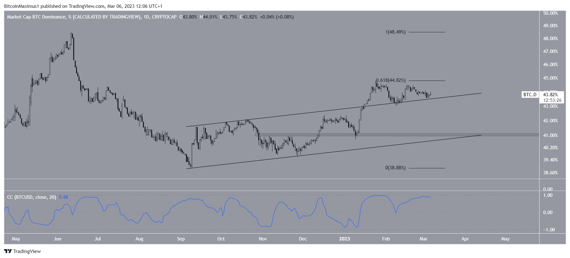 O BTCD saiu de um canal paralelo de alta em 17 de janeiro. Ele atingiu uma alta de 44,79% oito dias depois. No entanto, foi rejeitado pelo nível de retração de 0,618 e caiu desde então. Atualmente, o BTCD mal consegue se manter na linha de resistência do canal.