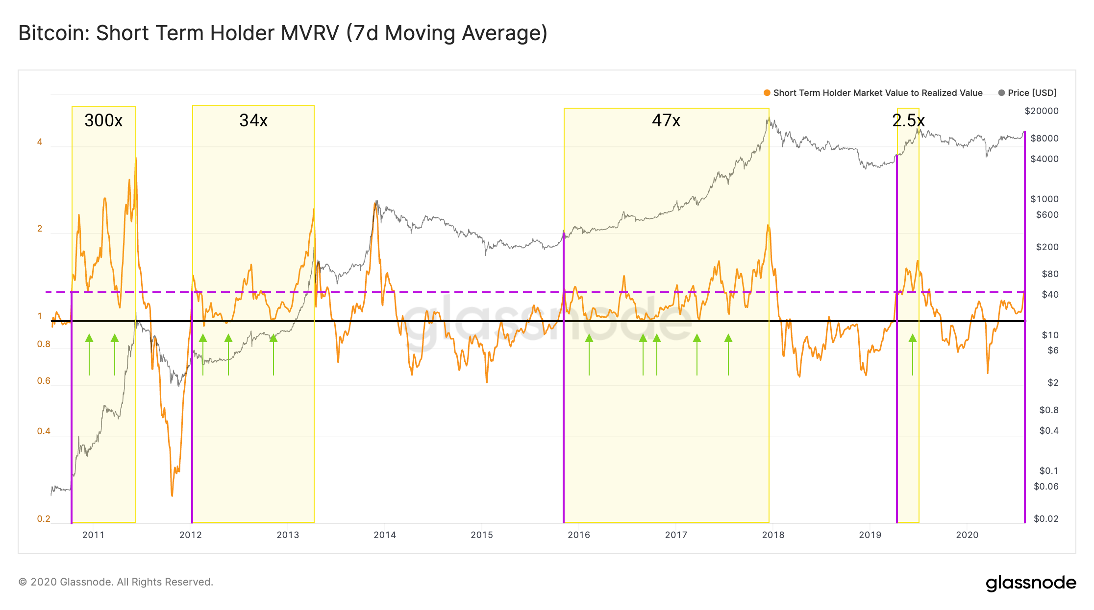 Segundo a empresa de análise de dados Glassnode, a métrica MVRV referente aos investidores de curto prazo subiu de menos de 1 para 1,25. O número indica, portanto, que os valores negociados no mercado estão acima do valor pago historicamente pelo BTC.