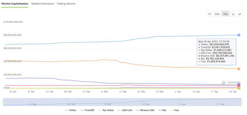 O mercado de stablecoin tem uma capitalização de cerca de US$ 131,6 bilhões. Dados da CoinGecko mostram que o Tether lidera a lista com US$ 81,1 bilhões, seguido pelo USDC e BUSD. A TrueUSD ocupa o quinto lugar com uma capitalização de US$ 2,04 bilhões após um surto de crescimento exponencial nos últimos dois meses. A DAI da MakerDao ocupa o quarto lugar com US$ 4,7 bilhões.