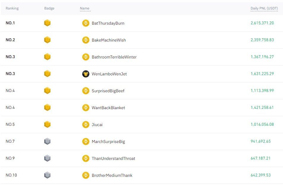 Na disputa semanal, o líder é um negociador que já tem mais de US$ 3 milhões de lucros. Já no mês, BatThursdayBurn é o usuário que teve ganhos, com USS 5,1 milhões de rendimento. Por outro lado, o maior trader de todos os tempos da Binance é o que usa o codinome WorkbookSurfSuccessful, que já fez mais de US$ 32 milhões em trades na exchange.