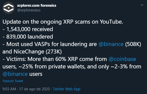 Desses, 839.000 XRP teriam sido lavados em exchanges. A maioria foi na Binance, com 508.000 XRP circulando pela corretora. Outros 273.000 XRP passaram pela NiceChange.