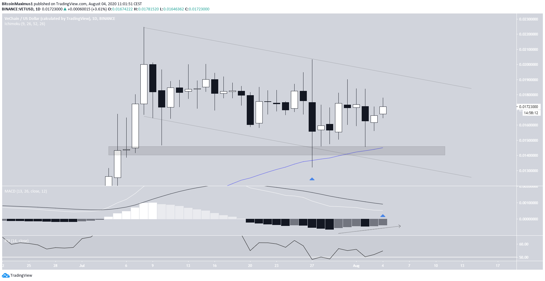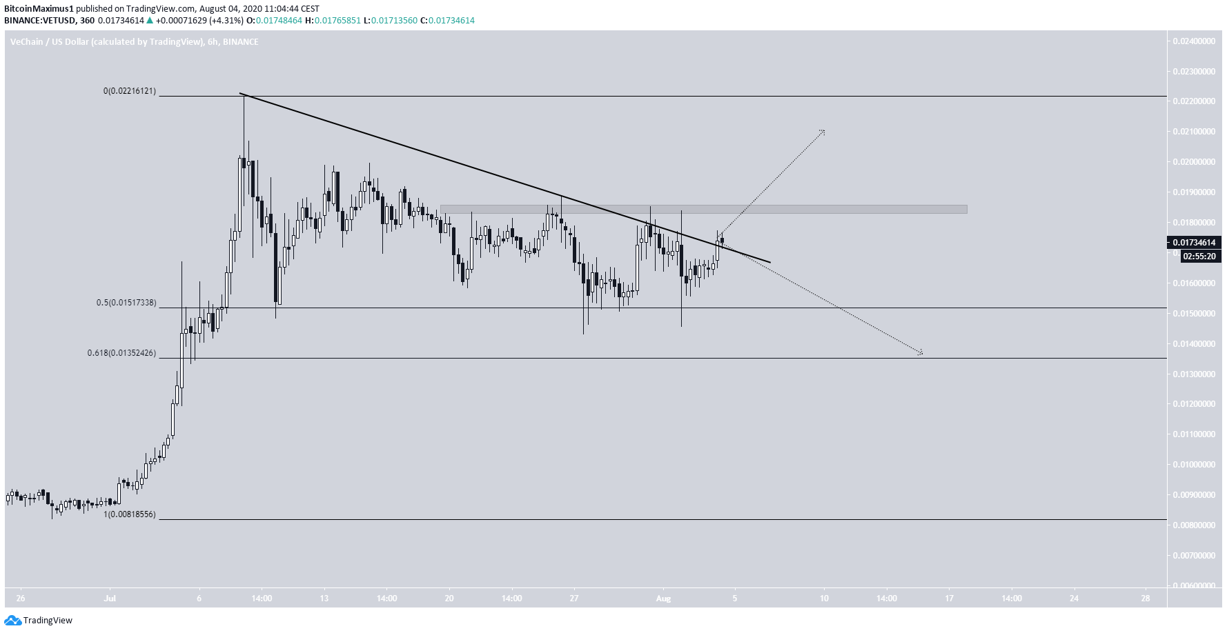 O preço da VET vem aumentando desde março, quando atingiu um nível mínimo de US $ 0,0013. O movimento ascendente tem sido extremamente potente. A alta de julho de US $ 0,022 resultou em um aumento de 1.500% em relação às baixas acima mencionadas.