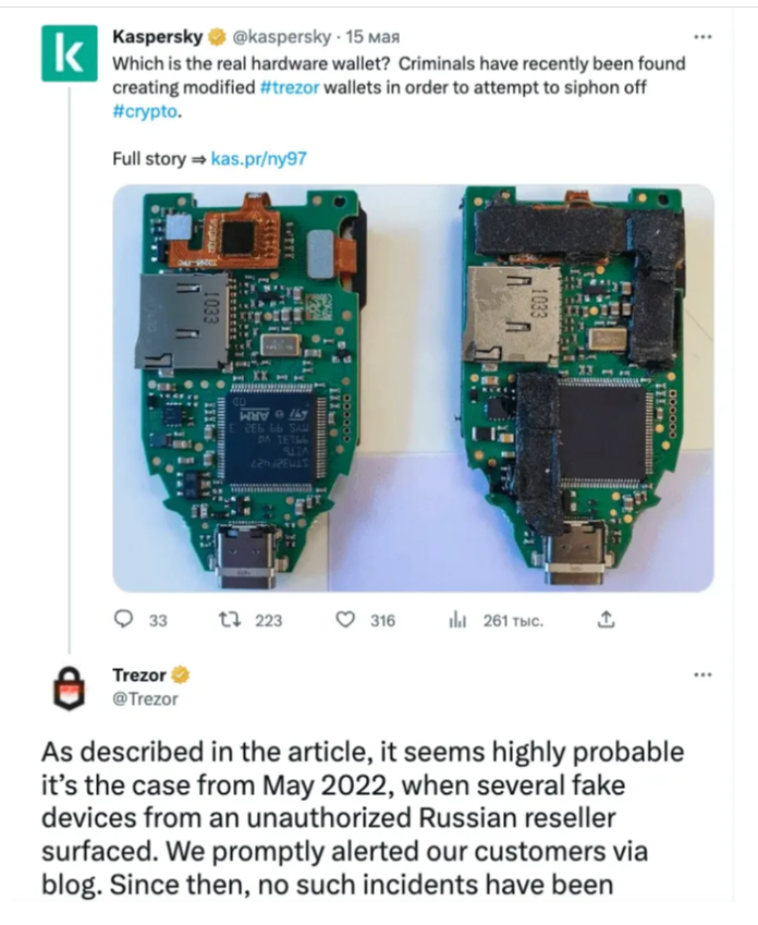 A segurança de um dispositivo de hardware depende da segurança física de sua memória (armazenamento de sua seed) e da tela. Qualquer adversário visa interferir nesta conexão.