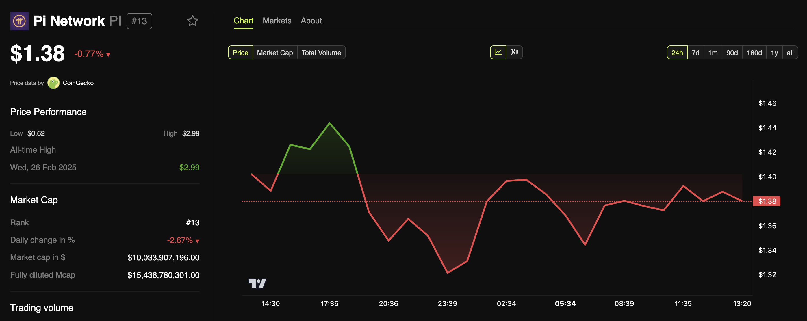 Como relatado anteriormente pelo BeInCrypto, investidores estão retirando seus fundos da Pi Network, com sentimento de baixa dominando o mercado. No momento da reportagem, a Pi Coin estava sendo negociada a US$ 1,3, uma queda de 0,7% nas últimas 24 horas.