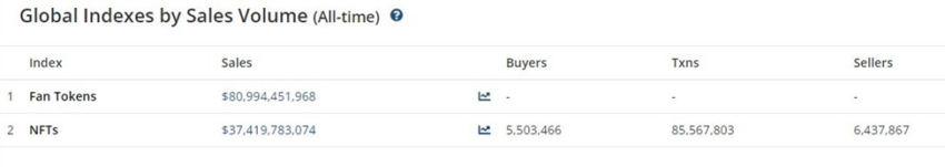 Em termos de volume de vendas, os fan tokens superaram em mais de US$ 40 bilhões as vendas de tokens não fungíveis (NFTs).