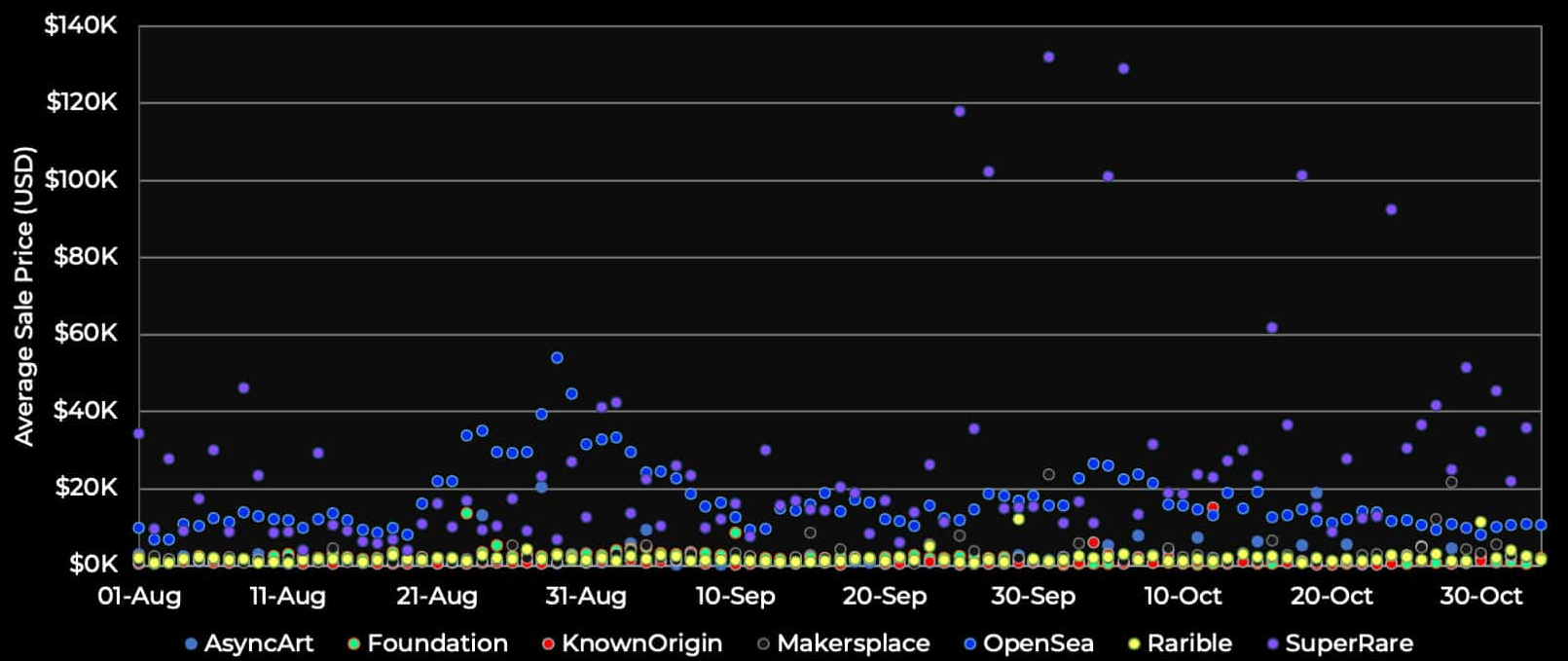 O relatório também analisa a venda de NFT de diferentes avaliações em diferentes plataformas. Os dados mostram que SuperRare e OpenSea são os mercados para NFTs de ponta, com SuperRare cruzando US$ 100.000 no preço de venda médio diário de NFTs em seis ocasiões. Mais comumente, porém, as duas plataformas têm um preço médio diário de venda de US$ 30.000 a US$ 60.000.