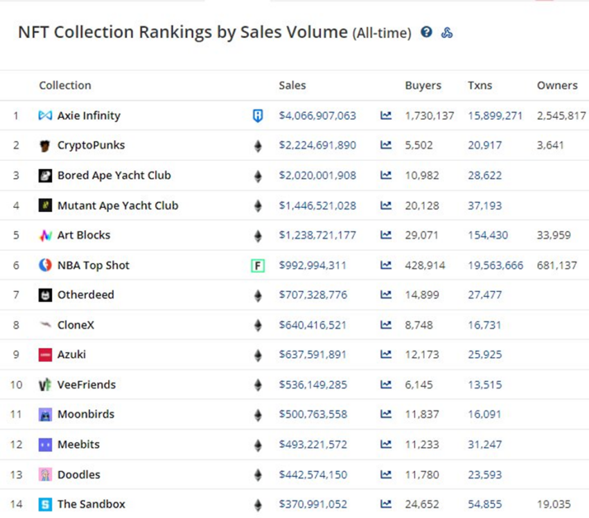 Com isso dito, o Bored Ape ainda está à frente de outros projetos importantes como Art Blocks, NBA Top Shot, Otherdeed, CloneX, Azuki, VeeFriends, Moonbirds, Meetbits e The Sandbox.