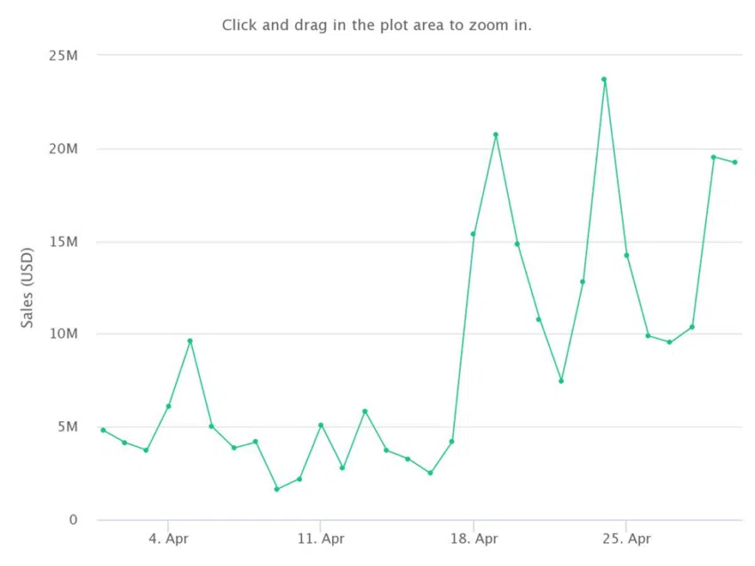 O valor médio de venda do MAYC foi de cerca de US$ 23.683 e isso representou uma redução de 74% no valor médio de venda de abril, que foi de US$ 92.874,65.
