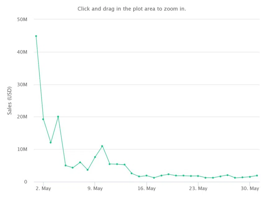 Ao registrar menos de US$ 50 milhões em vendas mensais pela primeira vez desde outubro (US$ 40,88 milhões), o MAYC atingiu um novo recorde em 2022, que foi uma queda de US$ 223,58 milhões nas vendas em relação a abril.
