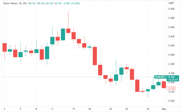 O ativo nativo do ecossistema Ronin foi negociado entre US$ 0,31 e US$ 0,46 em agosto, após abrir e fechar em US$ 0,43 e US$ 0,34, respectivamente.