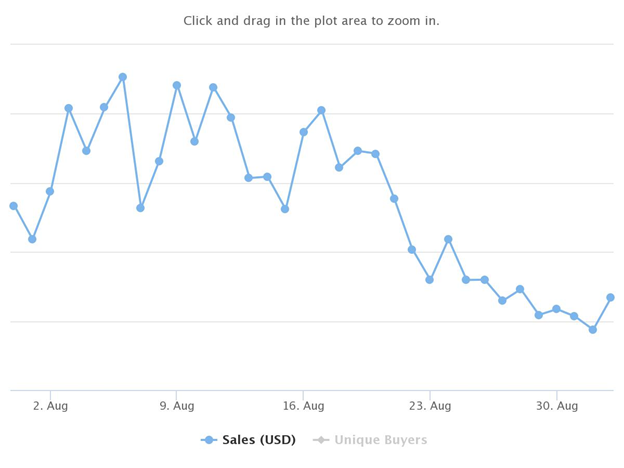 Isso significa que os compradores únicos e o total de transações em agosto de 2022 ficaram 94% e 95% abaixo dos números do mesmo período do ano passado. O valor médio de vendas também caiu 97% ano a ano, de US$ 457,66 em agosto de 2021 para US$ 11,94 em agosto de 2022.