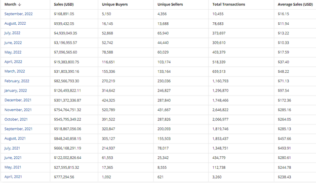 Coincidentemente, os números atuais vieram exatamente um ano depois que a blockchain atingiu um recorde histórico (ATH) em volume de vendas mensais de aproximadamente US$ 848 milhões.
