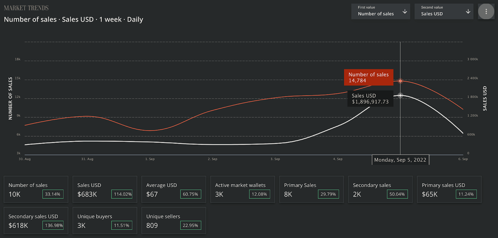 Enquanto isso, os dados do NonFungible também revelaram um aumento nas vendas na semana passada, chegando a US$ 1.896 milhões em volume de vendas ontem. A rápida atualização do Merge para o Ethereum agendada para a próxima semana teve um efeito particularmente marcante nas vendas secundárias, que dispararam 137%.