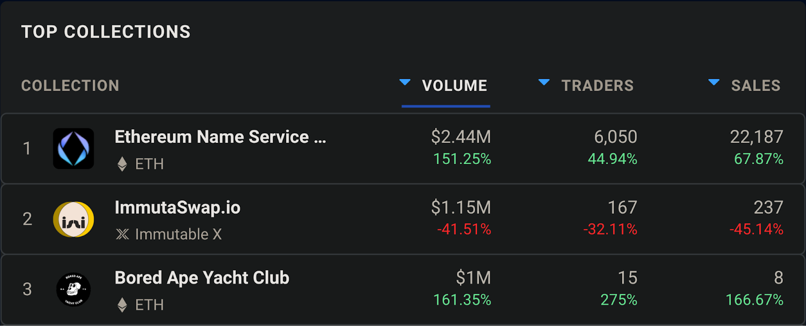 Com US$ 2,44 milhões em volume de negociação nas últimas 24 horas, a ENS é atualmente a número 1 entre as principais coleções de tokens não fungíveis, de acordo com a DappRadar.