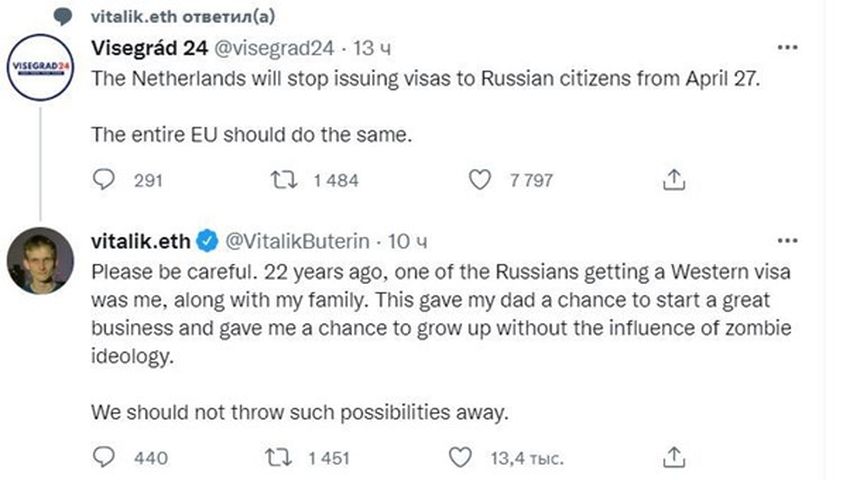 “Tome cuidado com isso [decisão de parar de emitir vistos]. Há 22 anos, minha família e eu éramos os mesmos russos que receberam um visto de um país ocidental. Isso deu ao meu pai a oportunidade de iniciar um bom negócio e tive a oportunidade de crescer sem a influência de uma ideologia zumbi’.