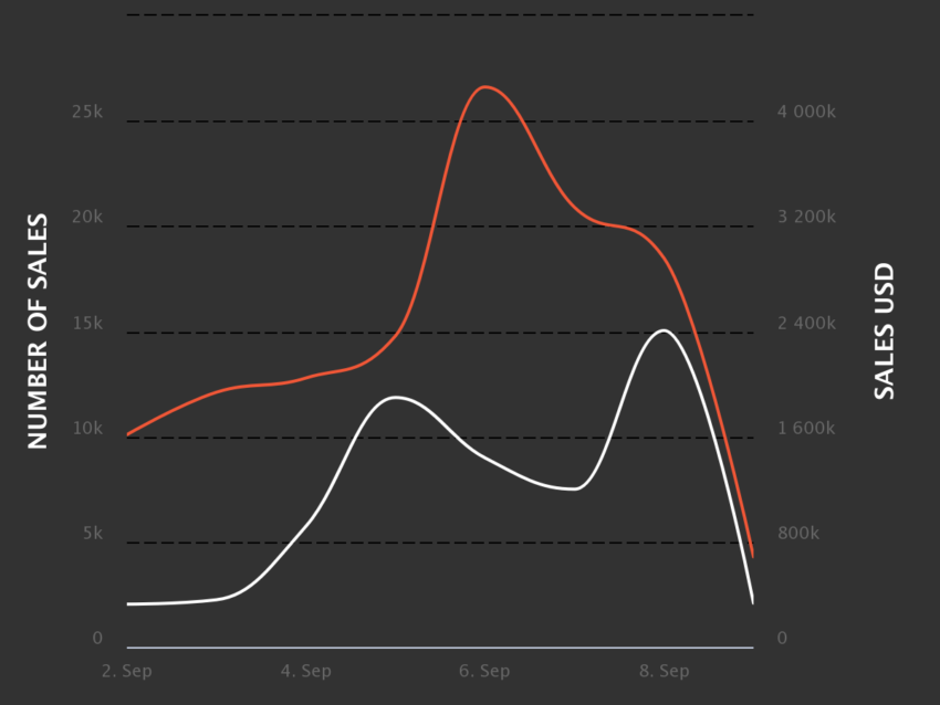 Enquanto isso, os dados do NonFungible também revelaram um aumento nas vendas na semana anterior. O número de vendas atingiu o pico de 26.610 no dia 6 de setembro, com US$ 1,4 milhão em volume de vendas.