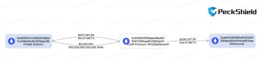 A empresa de análises PeckShield twittou nesta terça-feira (7) que um endereço associado a Vitalik Buterin havia vendido tokens MOPS, CULT e SHIK. Especificamente, o endereço registrou uma saída de 50 bilhões de MOPS, 9,9 bilhões de CULT e 5 trilhões de SHIK.