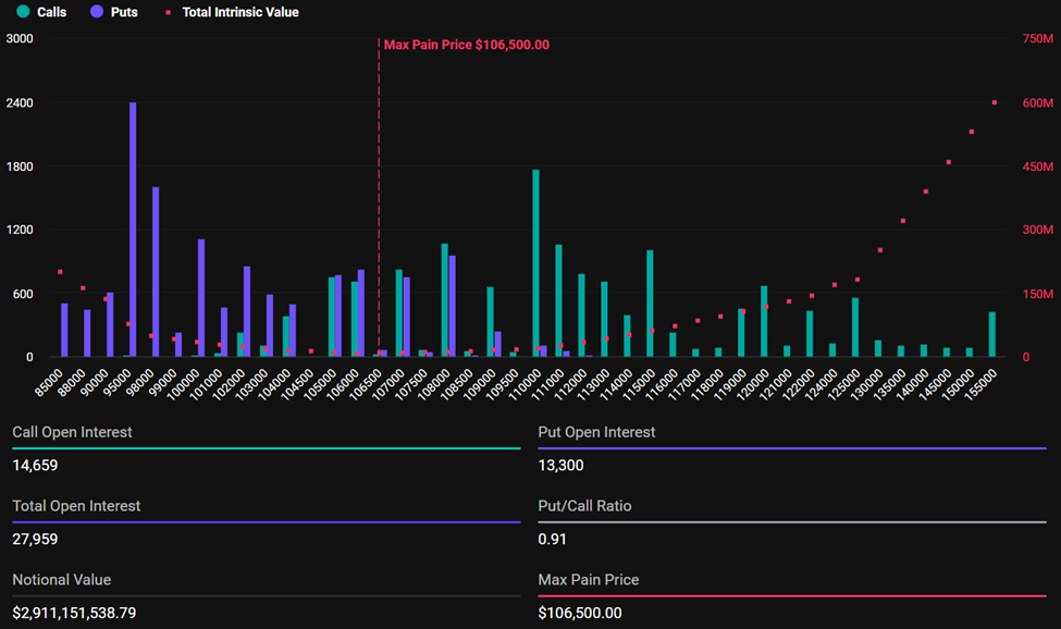 Hoje (13), 27.959 contratos de opções de Bitcoin expiram, com um valor nocional de até US$ 2,9 bilhões, representando a maior parte do total. O nível de dor máxima está em US$ 106.500, o que pode causar grandes perdas para traders. Além disso, a razão put-to-call de 0,91 indica que os traders estão mais otimistas, com mais opções de compra (Call) do que de venda (Put).