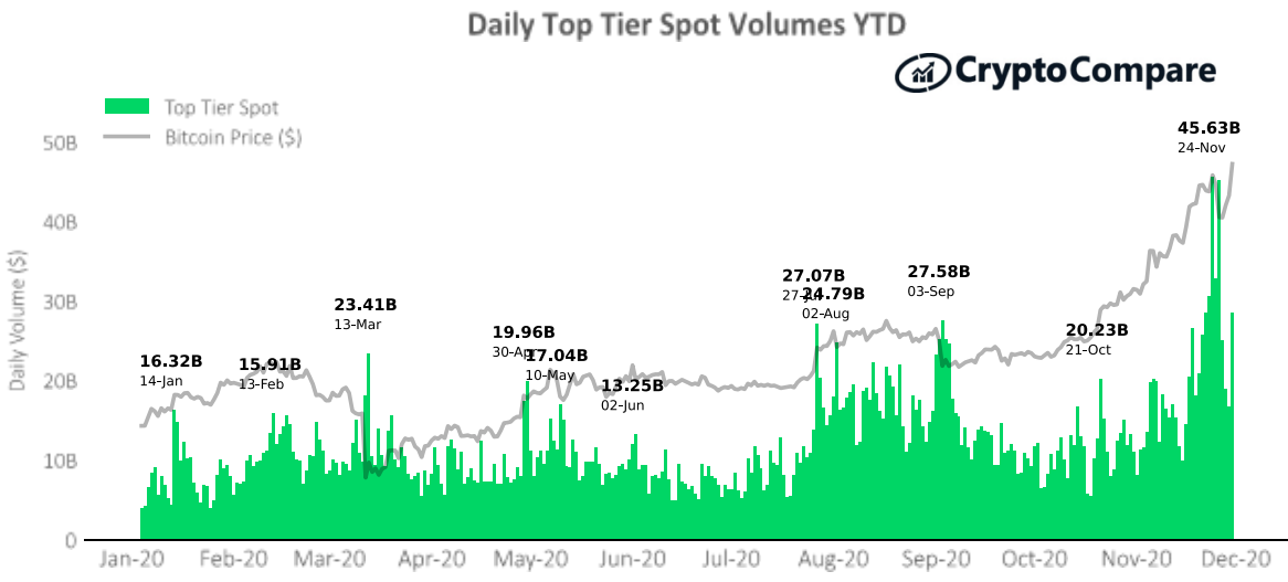 No mês passado, as exchanges de primeira linha negociaram US$ 45 bilhões no dia 24 de novembro, gravando o novo recorde de 2020.
