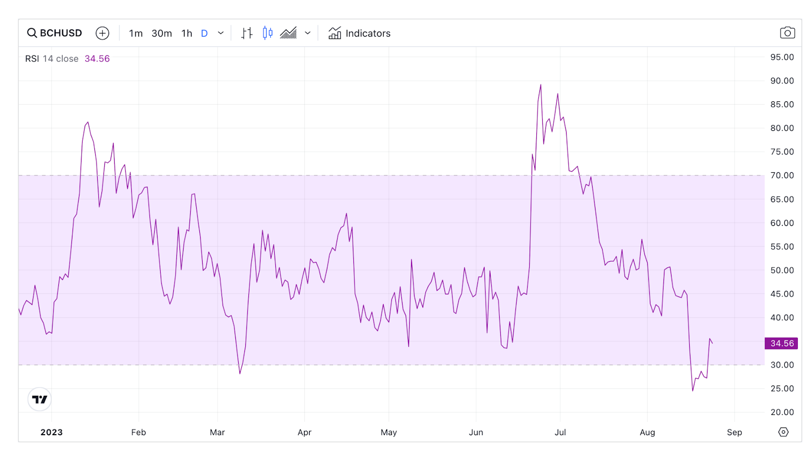 Após a turbulenta queda do mercado de altcoins na semana passada, o Bitcoin Cash entrou agora na zona de recuperação. De acordo com os dados diários do Índice de Força Relativa (RSI), o RSI do BCH ultrapassou a marca crítica de 30, atingindo 34 em 24 de agosto.