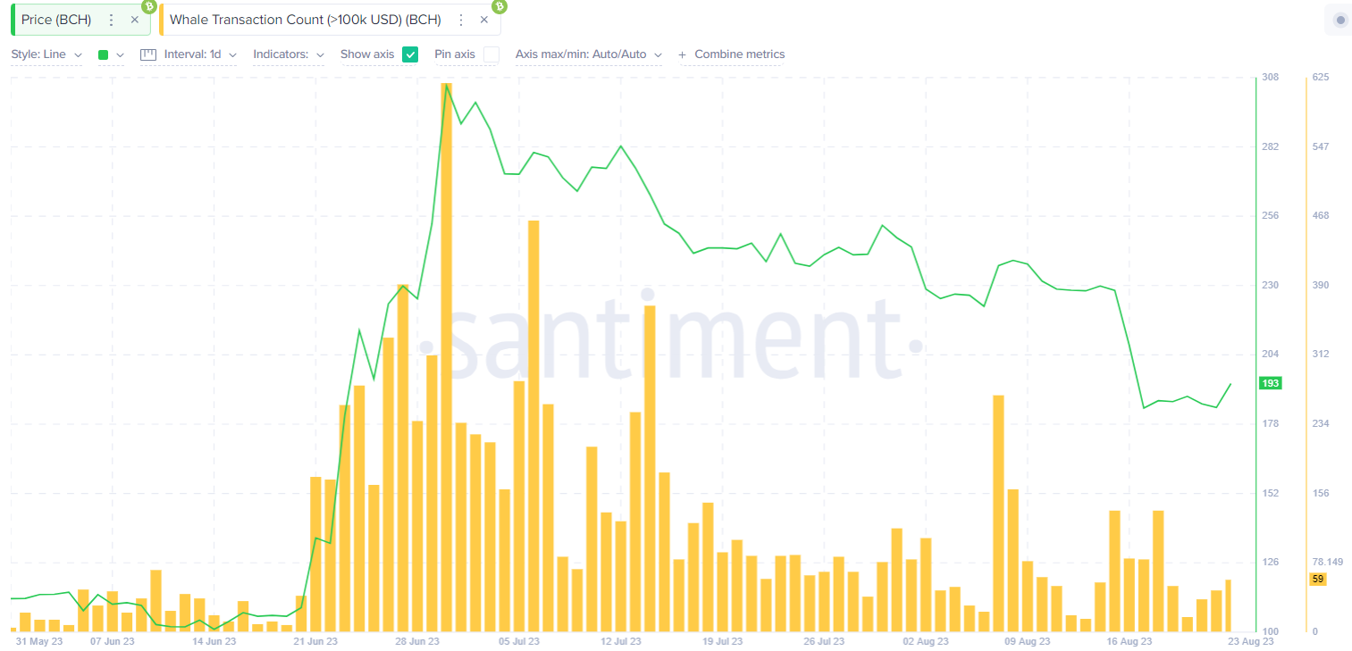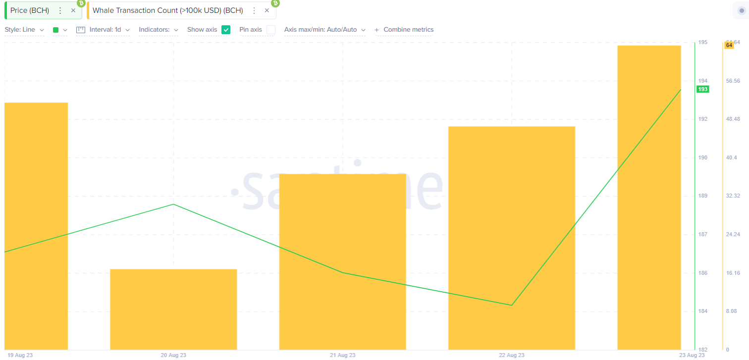 Da mesma forma que a atividade anterior de grandes transações – o BCH aumenta quando as grandes transações aumentam. Neste caso, o BCH aumentou mais de 3% desde 20 de agosto, passando do seu preço de abertura de US$ 185, subindo para US$ 192.
